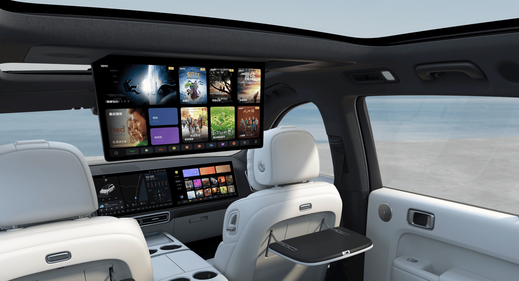 - Пассажиры второго и третьего ряда никогда не заскучают в дороге, ведь для них доступен потолочный экран с 3K разрешением и кинематографическим соотношением сторон 16:9.